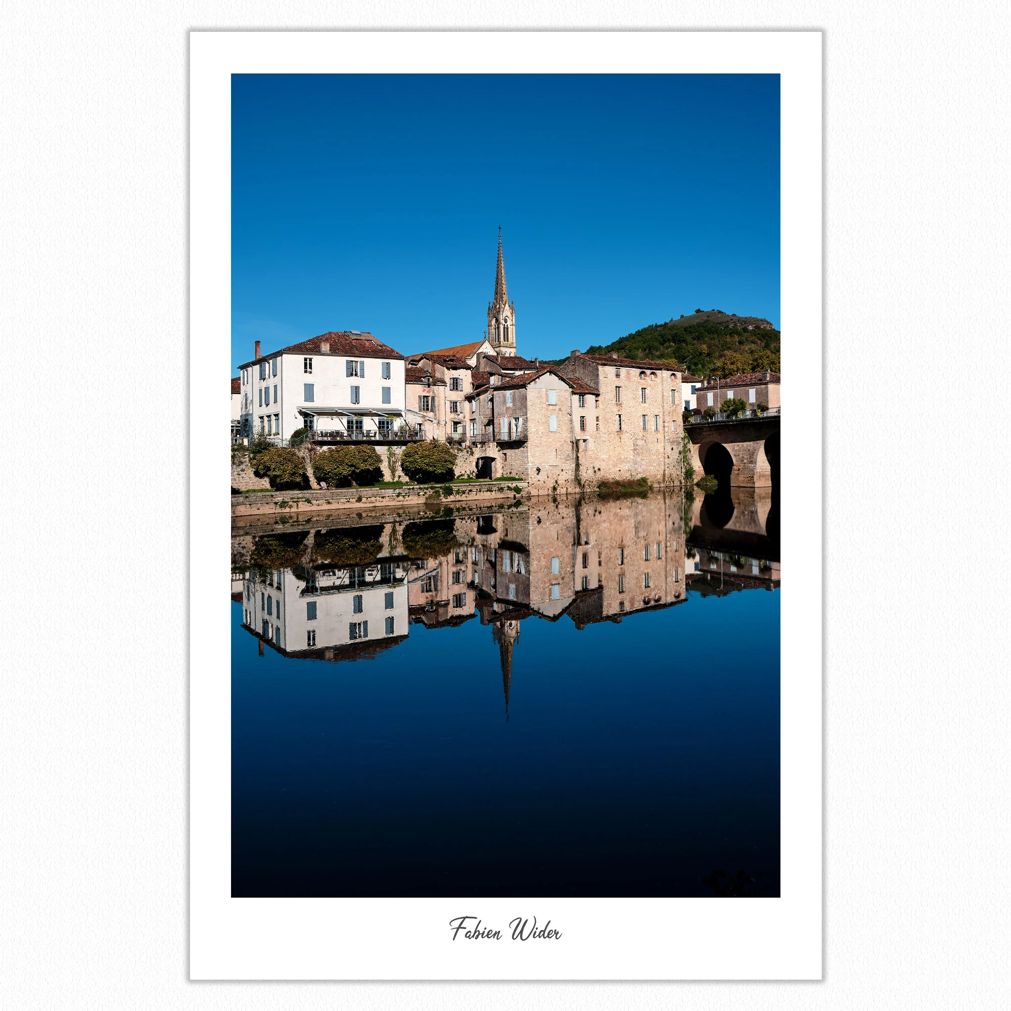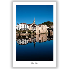 Saint‑Antonin‑Noble‑Val, avec une réflexion miroir sur l’Aveyron, où le bleu de l’eau répond à celui du ciel