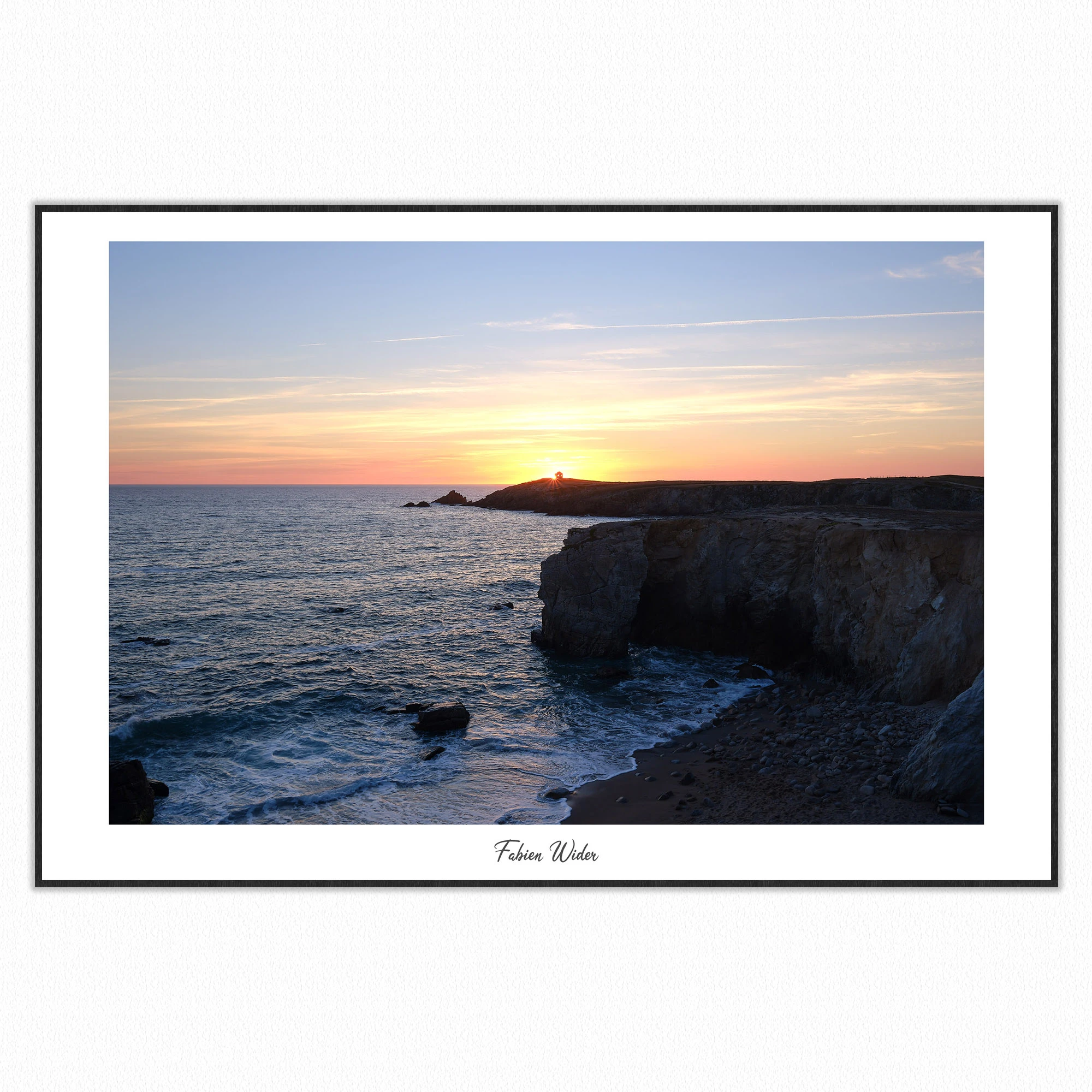 Coucher de soleil sur la Côte Sauvage, où la lumière du soir réchauffe la roche et adoucit l–horizon