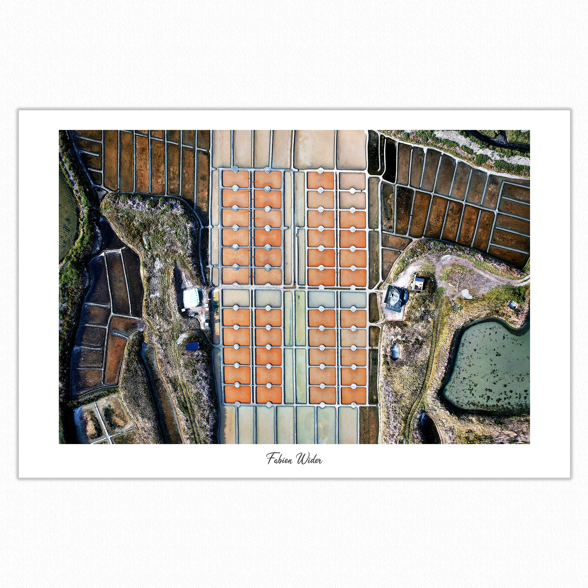 Vue aérienne des Marais Salants de Guérande, où les œillets aux nuances orangées composent un paysage graphique et lumineux