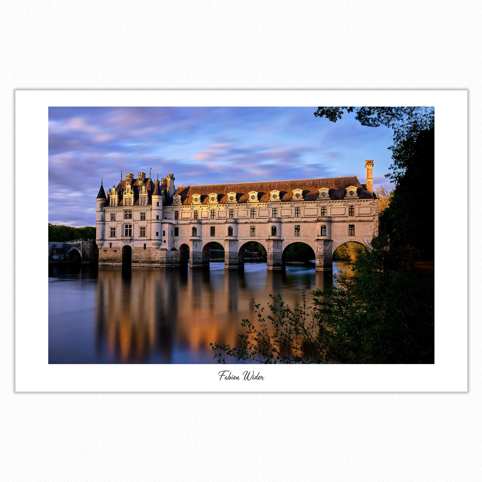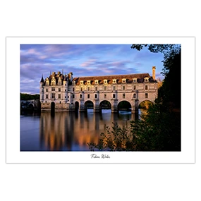 Le château de Chenonceau au coucher du soleil, dans un reflet bleuorange presque magique.