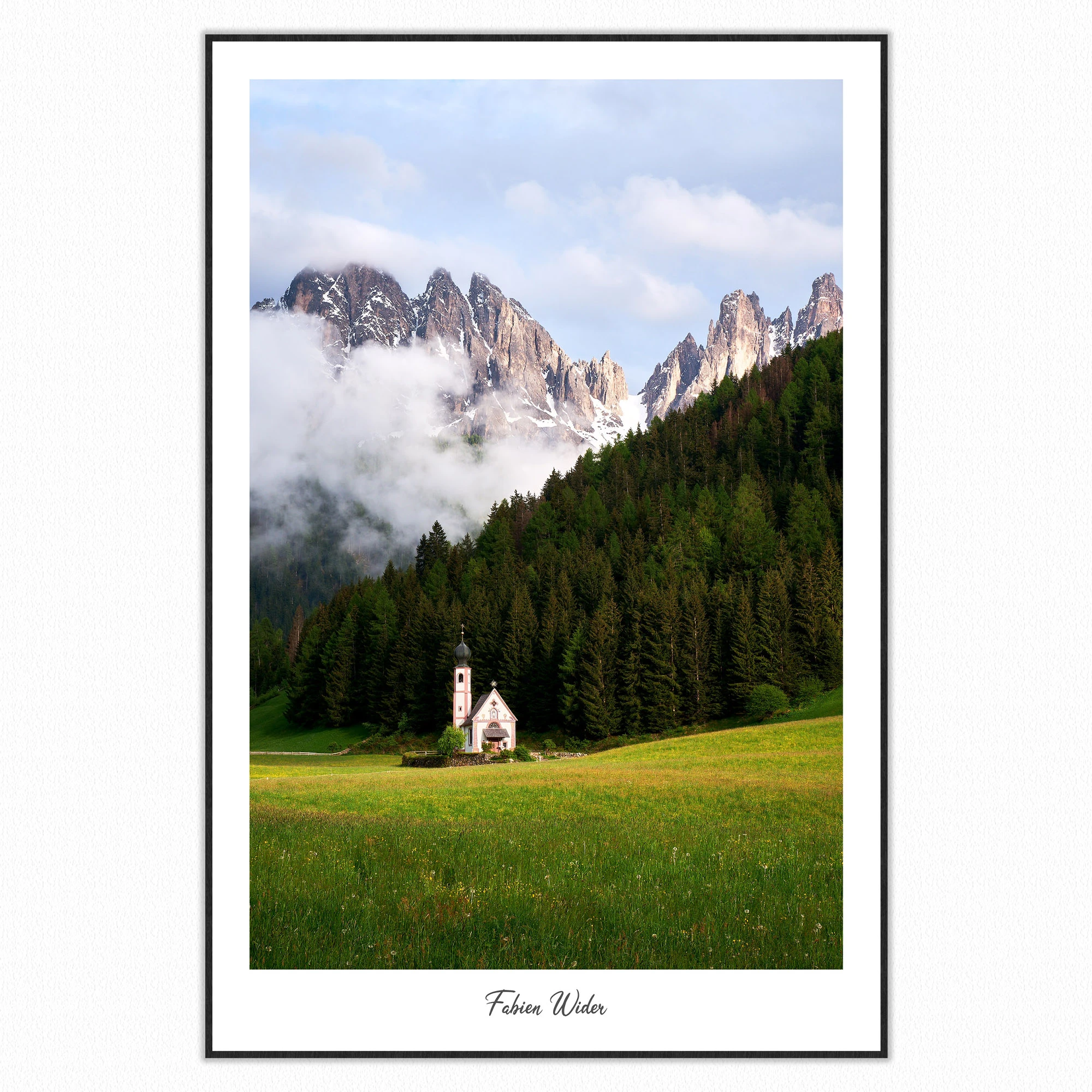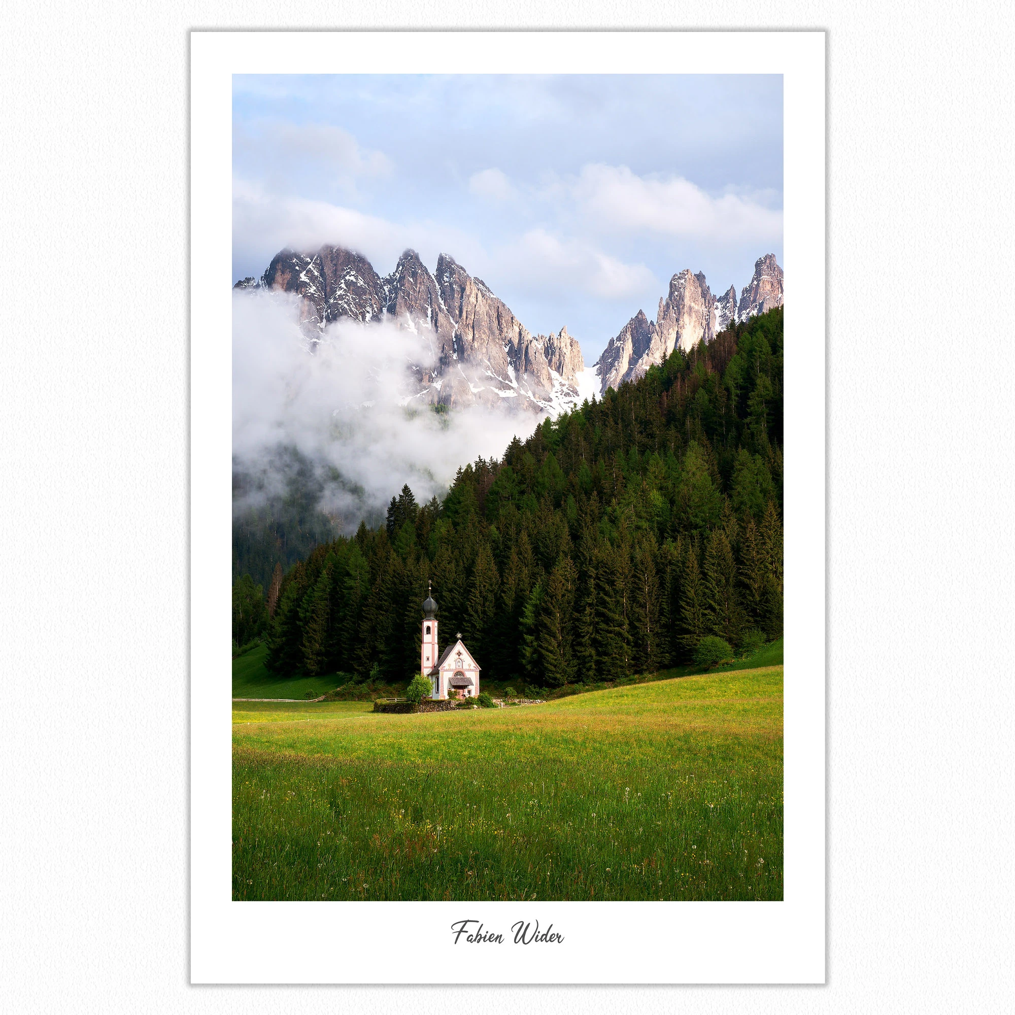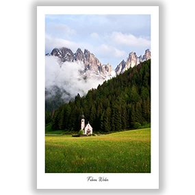 L’église San Giovanni in Ranui à la tombée du jour, avec en toile de fond les majestueuses montagnes dentelées des Dolomites enveloppées de brume